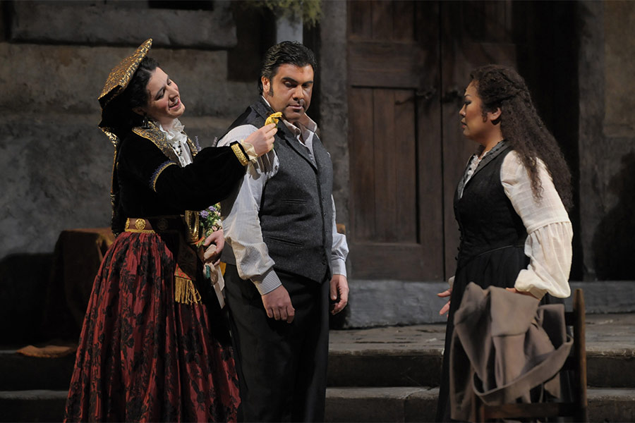 Katherine Lerner as Lola, Carlo Ventre as Turiddu, and Guang Yang as Santuzza in Lyric’s 2008/09 Cavalleria rusticana.